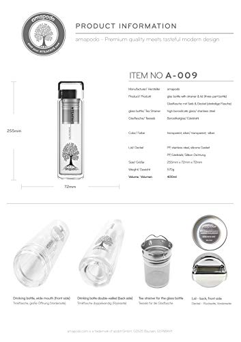 La tetera amapodo, con colador de acero inoxidable, filtro permanente con tapón de rosca, es una jarra de vidrio de alta calidad respetuosa con el medio ambiente. El gran tamiz de acero inoxidable con filtro de inserción es especialmente adecuado para el corte fino de té suelto. Usted utiliza el pequeño inserto de té para hojas de té o infusiones. El filtro de té y el colador de té tienen un tapón de rosca y pueden ser atornillados juntos o usados individualmente. El infusor de la jarra de vacío se puede quitar fácilmente como un huevo de té y permanece consecuente en la botella de termo durante la bebida sin que usted tenga que quitarlo.