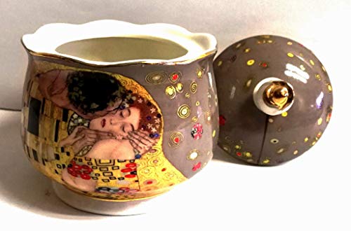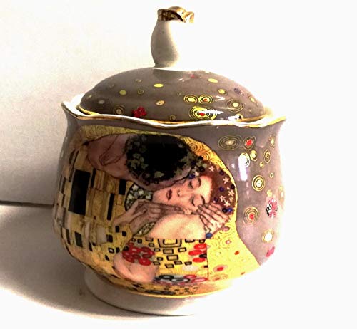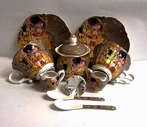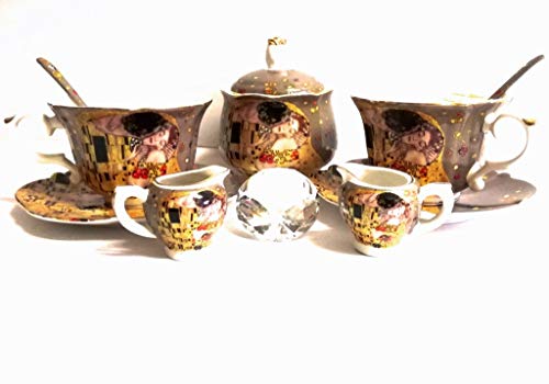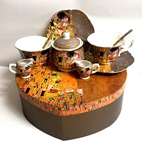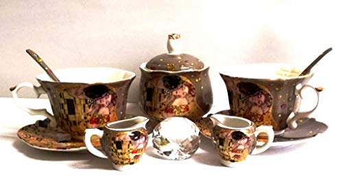 Juego de té barrido por: 2 tazas con diseño de Klimt, 2 platillos también con diseño, 2 cucharas, 1 azucarero con diseño y tapa, 2 jarras de leche con diseño. Se envía en una bonita joyero de regalo. Preciosos diseños inspirados en Gustav Klimt, con color áureo, por lo partida, no despabilado para lavavajillas. Diseño «El beso» también en el agarrador. Material: porcelana fina de porcelana de ceniza es la porcelana más señorial del mundo, ligeramente transparente y muy afable al tiento.
