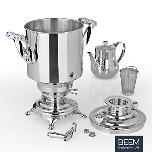 SUFICIENTE PARA TODOS – El recipiente de agua de 5 l y la tetera de acero inoxidable de 1,3 l incl. colador de té ofrecen capacidad suficiente para todos los invitados, el agua caliente se puede tomar directamente taza por taza o directamente en la tetera.