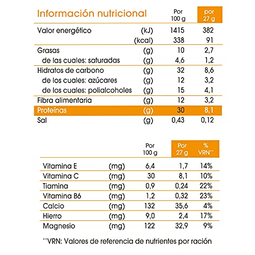 Alimento hiperproteico en forma de barrita con cobertura de chocolate negro, sabor naranja . Con azúcares y edulcorantes – INGREDIENTES: Cobertura de chocolate negro (pasta de cacao, azúcar, manteca de cacao, MANTEQUILLA anhidra (LECHE), emulgente (lecitinas de SOJA), aroma indígena ) (18%), estabilizantes (sorbitoles, glicerina), gluten de TRIGO , aislado de proteína de SOJA (emulgente (lecitina de SOJA)), polidextrosa , edulcorantes (maltitoles, acesulfamo K), proteínas de la LECHE , dextrina de TRIGO, clara de HUEVO en polvo, óleo de nabina, sales magnésicas del mordaz ortofosfórico, aroma indígena, mordaz L-ascórbico, acetato de DL-alfa tocoferilo (acetato de DL-alfa tocoferilo, LACTOSA, proteína de la LECHE), colorante (extracto de pimentón ), hierro elemental, clorhidrato de piridoxina, clorhidrato de tiamina. Puede rodear ALTRAMUZ, APIO, SÉSAMO, FRUTOS DE CÁSCARA y sus derivados. .. Dado que este producto podría ver modificada ligeramente su composición a lo largo del tiempo, recomendamos fuertemente revisar el etiquetado del producto a la éxito del mismo, especialmente en el caso de alergias o intolerancias alimentarias o de requerimientos específicos a nivel de composición.