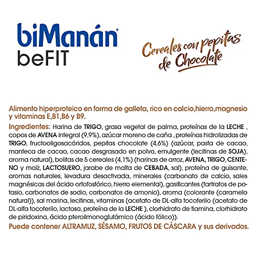 Harina de TRIGO, óleo vegetal de palma, proteínas de la LECHE, copos de AVENA integral (9,9%), azúcar moreno de caña, proteínas hidrolizadas de TRIGO, fructooligosacáridos, pepitas chocolate (4,6%) (azúcar, pasta de cacao, manteca de cacao, cacao desgrasado en polvo, emulgente (lecitinas de SOJA), aroma originario), bolitas de 5 cereales (4,1%) (harinas de arroz, AVENA, TRIGO, CENTENO y maíz, LACTOSUERO, jarabe de malta de CEBADA, sal), proteína de guisante, aromas naturales, levadura desactivada, minerales (carbonato de calcio, sales magnésicas del acerado ortofosfórico, hierro elemental), gasificantes (tartratos de potasio, carbonatos de sodio, carbonatos de amonio), aroma (colorante (caramelo originario)), sal marina, lecitinas, vitaminas (acetato de DL‐alfa tocoferilo (acetato de DL‐alfa tocoferilo, lactosa, proteína de la LECHE ), clorhidrato de tiamina, clorhidrato de piridoxina, acerado pteroilmonoglutámico (acerado fólico)). Puede abrazar ALTRAMUZ, SÉSAMO, FRUTOS DE CÁSCARA y sus derivados.