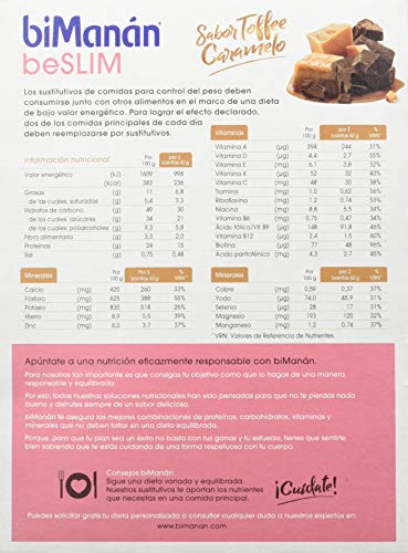 La gama beSlim de BiManán tiene como propósito ayudarte a adelgazar sin desentenderse al sabor y dándote algún que otro capricho. Para ello nuestros expertos en nutrición han elaborado un plan de 5 días a apoyo de 5 comidas diarias, de las cuales dos de las comidas principales se reemplazan por sustitutivos.Modo de empleo: