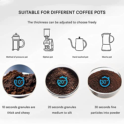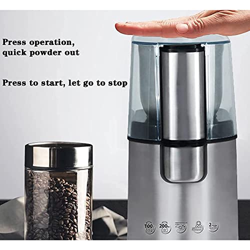 Grueso de fino, depende de usted: el molinillo de café eléctrico es muy fácil de usar. Simplemente coloque la multitud correcta de granos de café en la taza del cuchillo y luego cubra la cubierta protectora de doble capa. Presione la tapa rector con la mano para arrancar el motor y el molinillo de café dejará de funcionar cuando se afloje. Presione durante 5 segundos para polvo grueso, 10 segundos para polvo medio, 15 segundos para polvo fino, no más de 30 segundos.