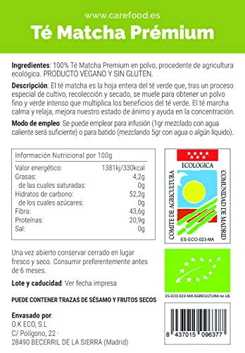 Carefood – Té Verde Matcha Premium 100% Orgánico – Té Matcha Ceremonial Bio y Apto para Veganos – 70 g