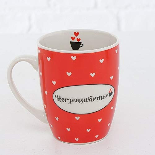 DETALLES: la taza grande tiene dimensiones: 12 x 11 x 8.5 cm (4.73 x 4.33 x 3.35 pulgadas) y Aforo: 350 cl (120 Oz). Sus gráficos internos impresos muestran una infografía de una taza de café con corazones rojos sobresaliendo, mientras que en el fuera el fondo rojo está enriquecido con corazones blancos y la palabra «Herzenswärmer» con el significado «sentimientos cálido» está encerrada en un óvalo.