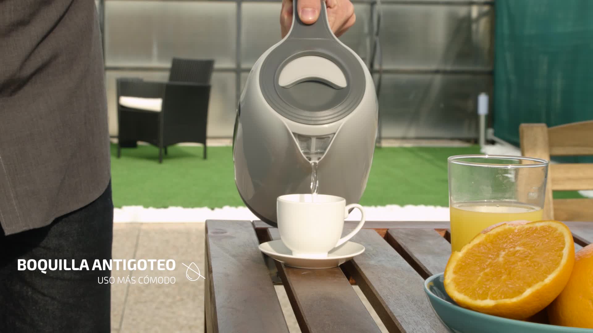 Estación base con giro de 360º que permite el uso tanto a diestros como a zurdos; sin cables; recipiente con base independiente que permite trasladar la jarra donde quieras; doble sistema de protección, desconexión automática contra funcionamiento en seco y contra sobrecalentamiento
