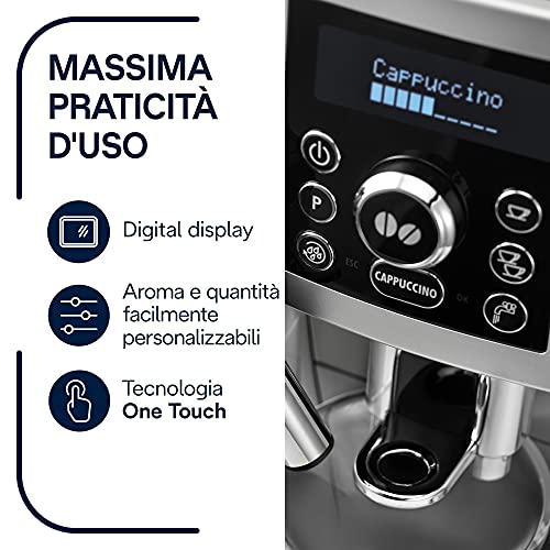 Cafetera Súper Cibernética Compacta. Presione un brote y gire la ruedecilla para personalizar su café estimado. Equipada con un máquina particular para adaptar una ebullición rica para su cappuccino, con suporte para tazas y con portafiltro.