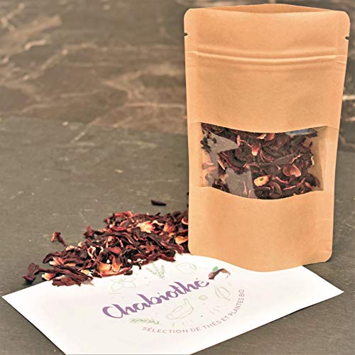 Vendido en bolsa transparente con autocierre (calidad alimentaria), que contiene 1 kg de flores de hibisco bio cortadas y secas.