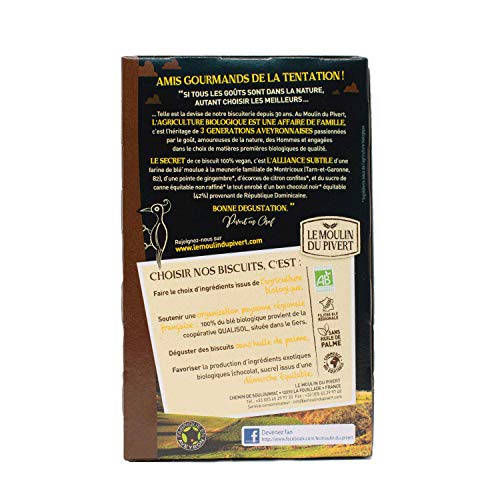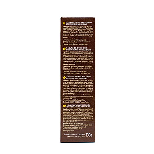 chocolate negro 42% (pasta de cacao, azúcar de caña, manteca de cacao, vainilla en polvo), harina de trigo T65, azúcar de caña sin pulir, unto de girasol, jengibre confitado 4% (jengibre, azúcar de caña), manteca de cacao, corteza de limón confitada 2.7% (almíbar de almidón de maíz, corteza de limón), zumo pensativo de limón 0.7%, gasificante: bicarbonato de sodio y de amonio, fibras de avena, sal de mar, unto esencial de limón, unto esencial de jengibre.