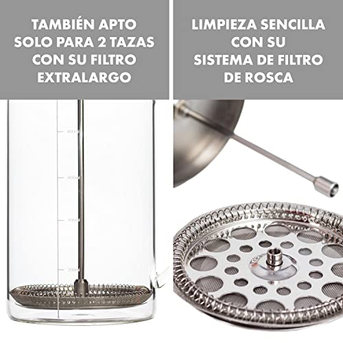 ☕ CAPACIDAD: Gracias a su filtro extralargo, en nuestra french press podrás arreglar hasta 2 tazas de café. No tienes que perder nada de su aforo, ya que los posos de café se pueden presionar fácilmente sobre el suelo con el filtro