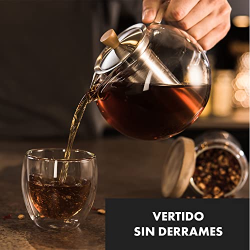 ☕ VIDRIO DE BOROSILICATO: Tetera cristal hecha con materiales nobles como el vidrio de borosilicato resistente al calor, el filtro té acero inoxidable y el botón de madera, que garantizan la durabilidad de la tetera de cristal