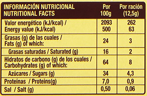 GALLETA (52%): HARINA DE TRIGO, AZÚCAR, MANTEQUILLA (6,2%), JARABE DE GLUCOSA-FRUCTOSA, LECHE DESNATADA EN POLVO, GASIFICANTES (CARBONATO ÁCIDO DE AMONIO, CARBONATO ÁCIDO DE SODIO, DIFOSFATO DISÓDICO), SAL, EMULGENTE (LECITINA DE GIRASOL). CHOCOLATE (48%): AZÚCAR, MANTECA DE CACAO, LECHE ENTERA EN POLVO, EMULGENTE (LECITINA DE SOJA), AROMAS. CACAO: 28% MÍNIMO EN EL CHOCOLATE.PUEDE CONTENER TRAZAS DE: FRUTOS DE CÁSCARA Y SULFITOS.