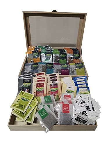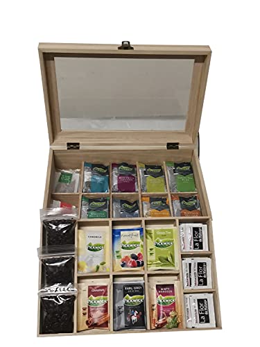 – 1 Ud. Caja de Madera – 80 Uds. de Infusiones Variadas: * Infusiones Ship 5 x Te Rojo 5 x Te Verde * Infusiones Pickwick Profesional (Bolsitas de Tela) 5 x Mint 5 x Red Fruit Infusion 5 x Green Tea Lemon 5 x Green Tea Pure 5 x English Breakfast 5 x Earl Grey 5 x Chamomile 5 x Rooibos Vanilla * Infusiones Pickwick Tradicional (Bolsitas de Papel) 5 x Camomile 5 x Forest Fruit 5 x Green Tea Pure 5 x Cinnamon 5 x Earl Grey Original 5 x Minty Moroco -30 Uds, de Sacarina en Polvo.
