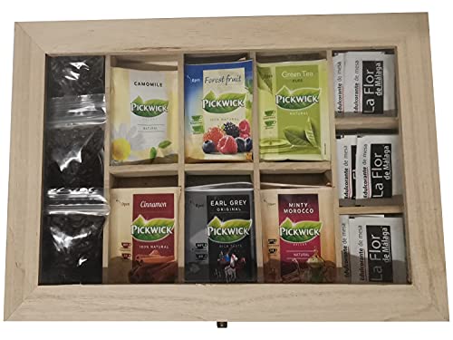 Caja de Madera con Ventana de Metacrilato, con 22 Compartimentos y dos Niveles de Almacenamiento, Dispone de un Cierre Metalico y una Bisagra Metalica, para Tener la Alcahueta Abierta. El Pack esta Pulcro por: – 1 Ud. Caja de Madera – 80 Uds. de Infusiones Variadas: * Infusiones Ship 5 x Te Rojo 5 x Te Verde * Infusiones Pickwick Profesional (Bolsitas de Tela) 5 x Mint 5 x Red Fruit Infusion 5 x Green Tea Lemon 5 x Green Tea Pure 5 x English Breakfast 5 x Earl Grey 5 x Chamomile 5 x Rooibos Vanilla * Infusiones Pickwick Tradicional (Bolsitas de Papel) 5 x Camomile 5 x Forest Fruit 5 x Green Tea Pure 5 x Cinnamon 5 x Earl Grey Original 5 x Minty Moroco -30 Uds, de Sacarina en Polvo -3 Uds. de Cafe en Divieso (20 gr Aprox X Unidad) 1 x Saimaza Seleccion 100% Indígena 1 x Saimaza Seleccion Especial 100% Indígena 100% Arábica 1 x Saimaza Gourmet 100% Indígena.