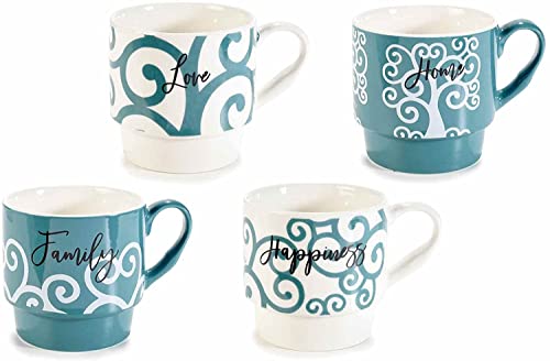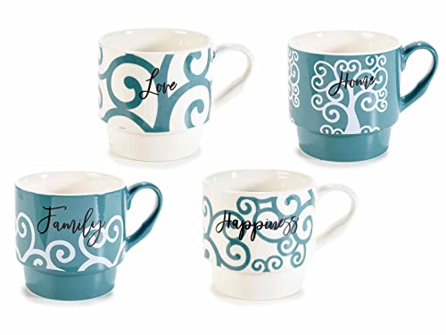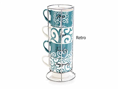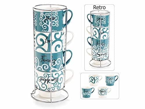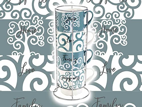 Juego de 4 tazas de café, té de porcelana con escritura, en un expositor de metal y una caja de regalo de metal.