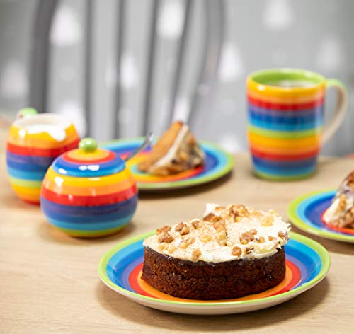 Un juego de azucarero y jarra de alfar pintada a mano. Decorado con rayas de colores arcoíris.