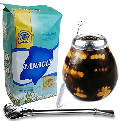 El juego de té mate contiene 500 g de Yerba Mate Taragui Liviana, un calabaza acción a mano de calabaza indígena, tubo de saciar de acero inoxidable y cepillo. Un juego completo para principiantes en el té mate