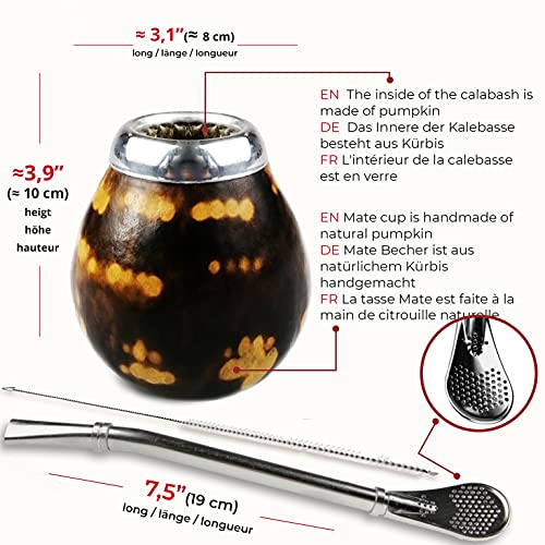 ✔ La palabra Mate viene del recipiente para saciar, el matís, una calabaza que se utiliza para saciar. Para la preparación de té mate (tipo tradicional) se necesita una calabaza y una bombilla. El Yerba Mate se llena en el vaso de té y se vierte con agua. A través de la bombilla se bebe entonces este extracto preparado.