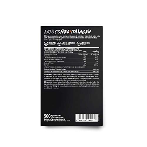 Colágeno hidrolizado, café instantáneo, triglicéridos de cadena media microencapsulados [triglicéridos de cadena media (de aceite de coco), agente de recubrimiento E414 (goma arábica)].