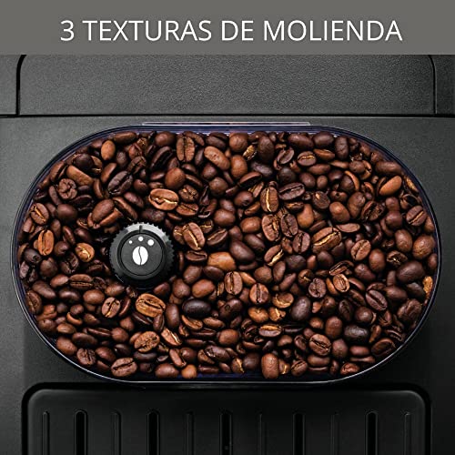 El molinillo con muelas cónicas de metal, dispone de tres texturas diferentes, lo que te permite acceder unos ristrettos, espressos y cafés largos de calidad óptima
