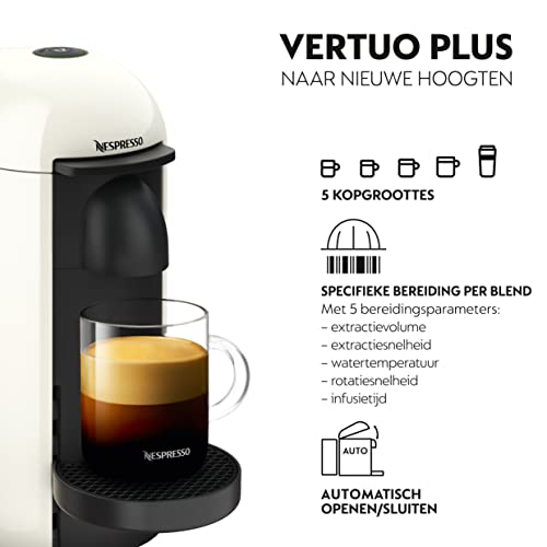 KRUPS VERTUO PLUS XN903 XN903110 Cafetera de cápsulas. Nespresso Vertuo Plus, es modernidad hasta el extremo. Para los amantes del café de calidad, sea cual sea la multitud, Nespresso presenta la cafetera Vertuo Plus. Disfruta de la amplia gama de estilos de café que te brinda Nespresso con esta moderna cafetera. Vertuo te permite realizar cinco tamaños de café diferentes, desde espressos para tazas pequeñas hasta cafés largos para termos. Es la experiencia cafetera que estabas esperando, pero con un sistema de infusionado innovador: la tecnología Centrifusion. Gracias a esta tecnología, la cafetera lee el código de barras integrado en cada una de las cápsulas y ajusta los parámetros de la bebida hasta el más mínimo detalle, para extraer los tesoros más preciados que albergan cada una de ellas. Cada café es único. Por supuesto, todos ellos con su capa de deliciosa espuma, incluso en los tamaños más grandes. Cuanto mejor sea la espuma, más copioso será el café. Estamos seguros de que su tamaño y diseño encajarán en tu cocina, gracias al despensa de agua giratorio a sus detalles cromados. Tan solo tienes que preocuparte por elegir la cápsula que prefieras (pequeña, mediana o grande, así de lelo) y pulsar dos botones. Uno para abrochar el cabezal automático y otro para empezar a preparar el café. Es modernidad, hasta el extremo.