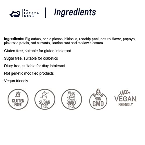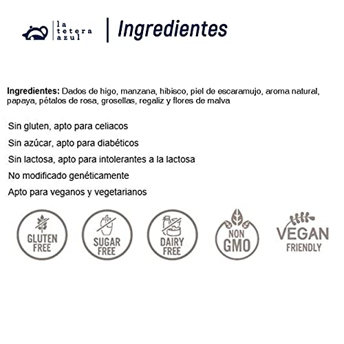 🌿 INGREDIENTES: Dados de higo, manzana, hibisco, piel de escaramujo, aroma natural, papaya, pétalos de rosa, grosellas, regaliz y flores de malva. Nuestras infusiones, por la naturaleza de sus componentes, NO contienen gluten, NO contienen materias primas genéticamente modificadas y NO contienen trazas animales.