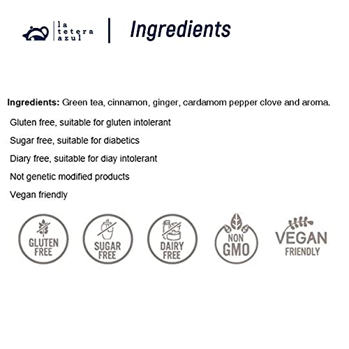 🌿 INGREDIENTES: Té verde, canela, jengibre, cardamomo, pimienta, clavo y aroma. Una edición Premium de La Tetera Azul. Nuestras infusiones, por la naturaleza de sus componentes, NO contienen gluten, NO contienen materias primas genéticamente modificadas y NO contienen trazas animales.