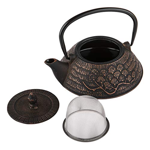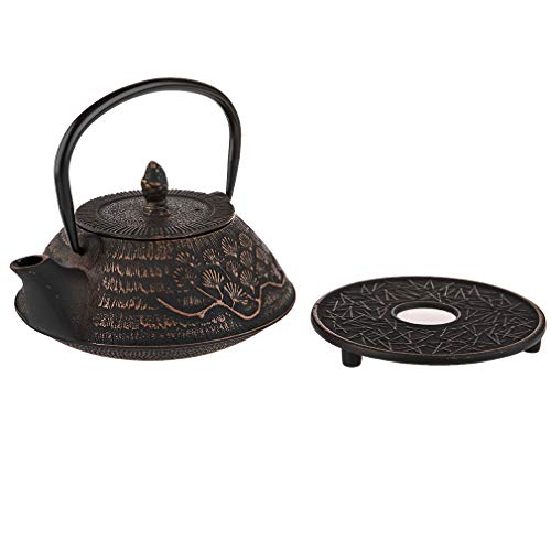 Guapo juego de té de hierro fundido en un bonito tono negro con motivos de color bronce, adornado con pino japonés, auténtico símbolo de longevidad en Japón. Un juego de té imprescindible para todos los amantes de Japón y los amantes del té