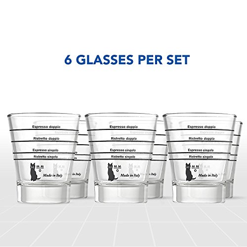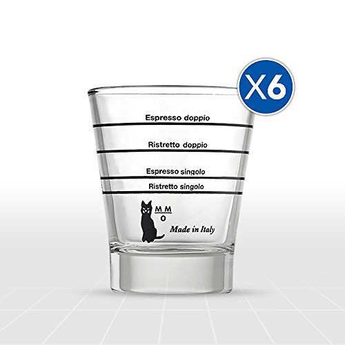 Accesorios útiles fabricados en Italia para completar; la elegante prensa de metal, la estación portafiltro y un deleitable juego de 6 tazas de cristal graduadas by Motta