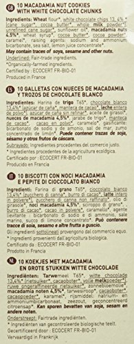Harina de trigo T65*, chocolate blanco*(azúcar de caña*, manteca de cacao*, leche entera de polvo*) 13,4%, azúcar de caña sin refinar*, óleo de girasol*, nueces de macadamia 4,5*, jarabe de trigo*, manteca de cacao*, cacao en polvo*, caramelo*, gasificante: bicarbonato de sodio y de amonio, sal de mar, zumo abismado de limón*. *Procedente de agricultura ecológica