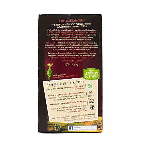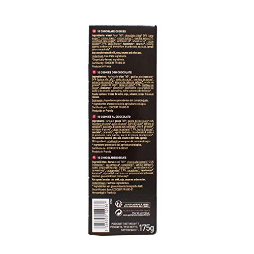 Harina de trigo T65, pepitas de chocolateº (24%) (azúcar de caña, pasta de cacaoº, manteca de cacaoº, extracto de vainillaº), azúcar de caña sin refinarº, grasa de girasol, mantequilla, jarabe de trigo, cacao en polvoº (2.9%), avellanas, caramelo, gasificante: bicarbonato de sodio y de amonio, sal marina, zumo meditabundo de limón. ºIngredientes procedentes del comercio ajustado. de agricultura ecológica.