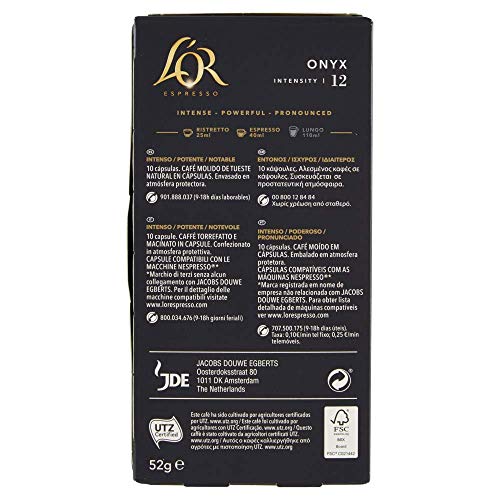 Café L’OR Espresso Onyx 10 cápsulas, intensidad 12. Cápsulas de aluminio compatibles con cafeteras Nespresso.