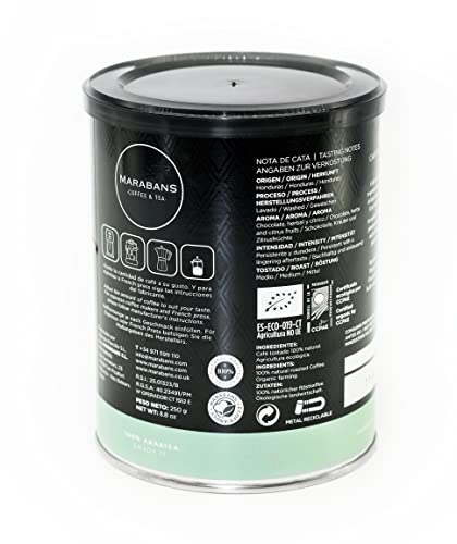 Marabans café orgánico en grano. Bote 250 gramos. ORIGEN: Honduras. Café tostado 100% natural.