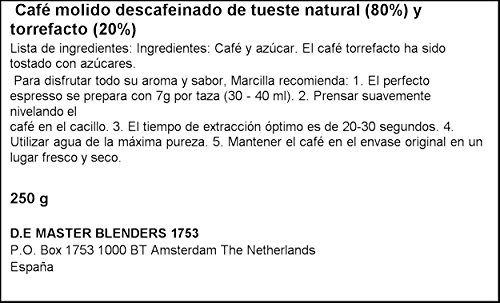 Café molido descafeinado de tueste vernáculo (80%) y torrefacto (20%), y azúcar.
