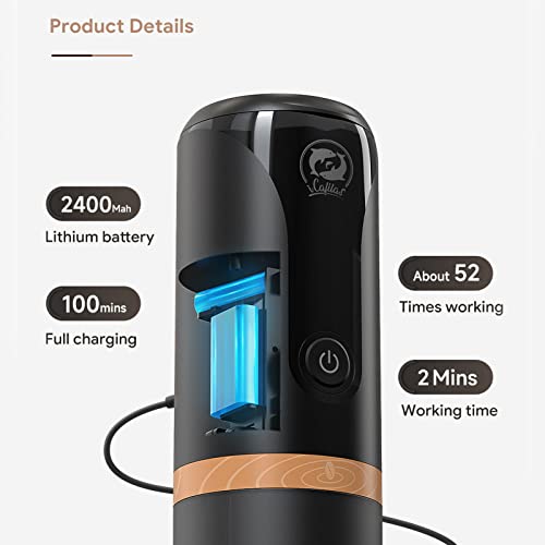 【CAFETERA PORTÁTIL】 Esta cafetera portátil tiene una batería de iones de litio de 1200 mAh incorporada, se carga por USB y el tiempo de carga es de 100 minutos, el tiempo de trabajo único: 2 minutos. Tiempos de trabajo continuos con plena potencia: 52 veces; Capacidad del abastecimiento de agua: 120 ml; Capacidad Café: 100ml.