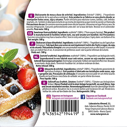 Ingredientes: Eritritol (100%). Ingrediente procedente de la agricultura ecológica. Este producto se fabrica en una planta dónde se manipulan frutos secos, soja y sésamo.