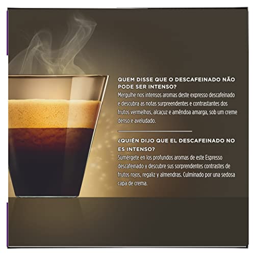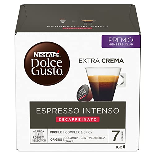 Nescafé Dolce Afición Intenso Cápsulas Descafeinadas es un café potente y auténtico. Tiene una crema oscura y sedosa que revela los salvajes contrastes de los frutos rojos del bebida, regaliz y almendras amargas. Está descafeinado con agua y conserva su maravilloso sabor, aromas e intensidad. Una deliciosa cóctel en una sola cuerda. Tiene el mismo esencia, carácter y sabor que el Espresso Intenso, descafeinado con agua, conservando todo el esencia y sabor.