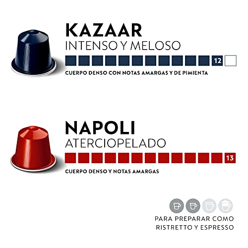 Pack de 100 cápsulas de café con 5 variedades de café intenso: 20 cápsulas Ristretto, 20 Arpeggio, 20 Roma, 20 Kaazar y 20 Napoli. Tueste intenso
