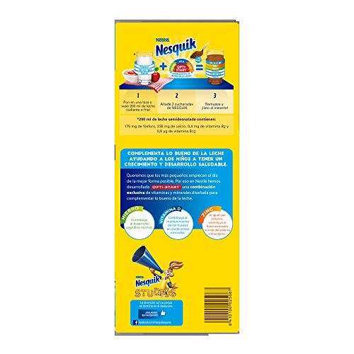 Chocolatea tu leche al instante con Nestlé Nesquik. Disfruta de su irresistible sabor a chocolate. El cacao instantáneo Nesquik está enriquecido con OPTI-START, una combinación exclusiva de vitaminas y minerales, que complementa lo bueno de la leche y lo hace óptimo para ungan venida del día. Nesquik cacao soluble se diluye instantáneamente tanto en leche fría como caliente. sin gluten.