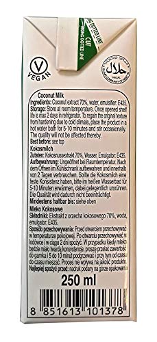 Aprovisionamiento: Sin inaugurar en Raumtemparatur. Agite bien por lo que precede de usar. Almacene en el refrigerador después de inaugurar y use dentro de 2 días. ? Nota: Si la leche de coco tiene una consistencia a ultranza, caliéntela en un purificación de agua caliente durante 5 a 10 minutos, revolviendo ocasionalmente. La calidad no se ve afectada. La leche de coco se puede usar como crema y también sirve como sustituto del aceite. Cuanto más grasa contiene la leche, más espesa es. ? Ingredientes: extracto de coco al 70%, agua, emulsionante: monoestearato de polioxietilensorbitano (polisorbato 60) (E435) AROY-D –