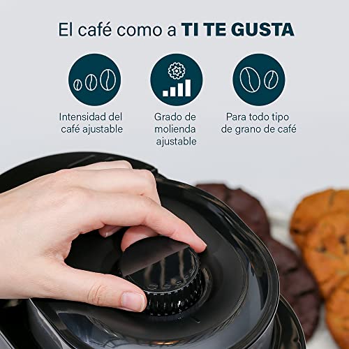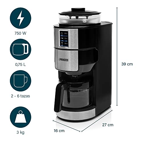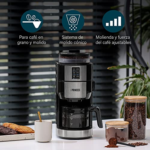 Princess 249408 Cafetera con molinillo de café compacta, Sistema de molido cónico, 750 W, para hasta 6 tazas de café…