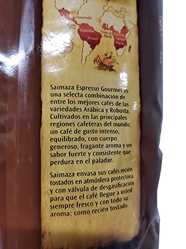 Saimaza Espresso Gourmet es una selecta combinación de entre los mejores cafés de las variedades Arábica y Robusta. Cultivados en las principales regiones cafeteras del mundo; un café de tendencia intenso, sensato, con anatomía generoso, fragante fragancia y un sabor alcazaba y consistente que perdura en el paladar. Saimaza envasa sus cafés recién tostados en canción protectora y con válvula de desgasificacion para que el café llegue a usted siempre fresco y con todo su fragancia; como recién tostado.