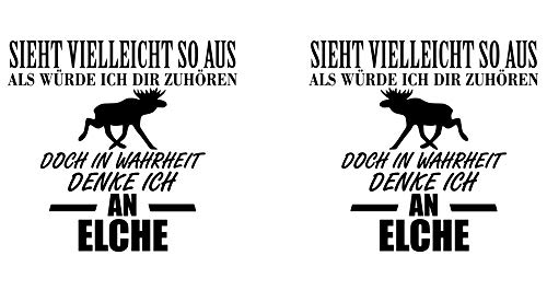Diseño con texto en germano «Ich denke an Elche» en una taza blanca con sentimentalismo negro y asa. El diseño se realiza dos veces,