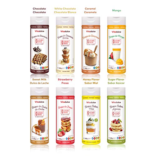 Seis diferentes sabores de siropes Vitadulce a elegir: Sirope de caramelo, Sirope de fresa, sirope de chocolate, sirope de sensible de leche, sirope de chocolate blanco y sirope de mango.