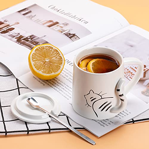 Taza de café con diseño de gato, taza de té con tapa y cuchara, de cerámica blanca con diseño de gato en 3D, regalo para…