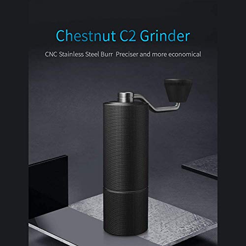 Timemore – Molinillo de café manual C2 de castaño y C2. Color: negro, blanco, rojo, azul. Tamaño del cuerpo: 52 mm de ancho x 147 mm de altura. Longitud del mango: 159 mm. Capacidad: alrededor de 20 g. Peso del cuerpo: espada inoxidable 6063. Resorte del mango: aleación de aluminio 6063. Pomo de mango, tapa, perilla de ajuste de asperilla. Contenido del paquete: 1 g. Contenido del paquete: 1, cepillo y bolsa de suministro. 1. Manual de instrucciones (idioma español no garantizado). 1 unidad.
