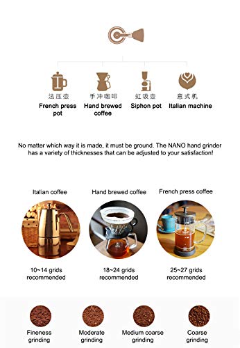 36 clics rango de ajustes de molienda: el molinillo Nano tiene un diseño de engranaje de escala, puedes sincronizar la escala de acuerdo a tus propias necesidades de molienda para satisfacer el sabor deseado (de súper grueso a fino) para café expreso, prensa francesa.