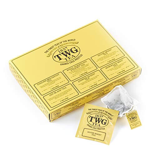 TWG Tea presenta la bolsita de té definitiva, de algodón inmaterial 100 % y totalmente cosida a mano, que contiene 2½ gramos de las mejores cosechas de espada entera y blends exclusivos. Este surtido escolar de bolsitas de té incluye English Breakfast Tea, 1837 Black Tea, Royal Darjeeling FTGFOP1, Silver Moon Tea, Jasmine Queen Tea y Moroccan Mint Tea en una magnífica arca de regalo.