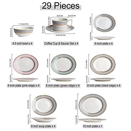 ✅[JUEGO DE VAJILLA 29 PIEZAS]servicio para 4, incluye: cuenco de 4,5 pulgadas x 4, juego de taza de café y platillo x 4, plato de 6 pulgadas x 4, plato de 8 pulgadas (reborde rosa) x 4, plato de 8 pulgadas (reborde verde). x 4, plato de 8 pulgadas (reborde negro) x 4, plato de sopa de 8 pulgadas x 4, plato de 10 pulgadas x 1. Estos juegos de cena se adaptarán a todas sus necesidades