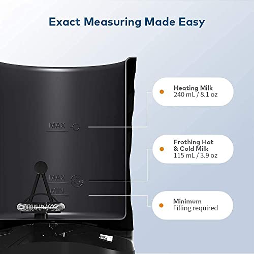 Gran extensión: para una espuma y calefacción óptimos, vierta la leche al indicador de volumen apropiado para transformar 115 ml / 3.9oz de leche entera en espuma cremosa, o exaltar un máximo 240ml / 8.1oz de leche